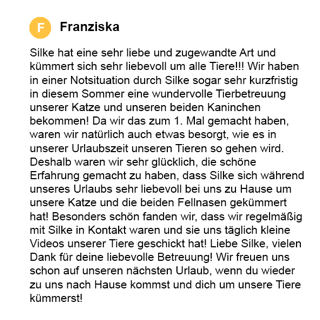 Tierbetreuung pro Besuch (ca. 1 Stunde): 30 €