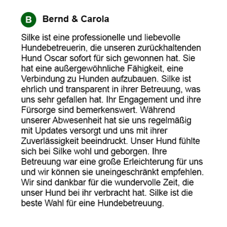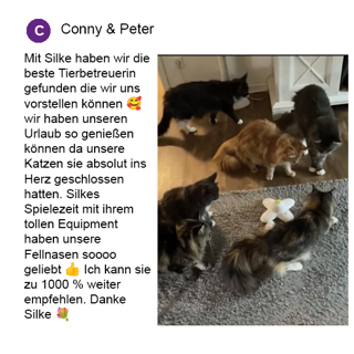 Für ein erstes Kennenlerngespräch bei Ihnen zu Hause, um sich gegenseitig "beschnuppern" zu können, entstehen Ihnen keinerlei Kosten. In diesem Gespräch besprechen wir alle wichtigen Einzelheiten zur Betreuung und machen sorgfältige Notizen. Bei uns erhalten Sie eine persönliche Unterstützung, die genau auf die Bedürfnisse Ihrer Lieblinge abgestimmt ist.